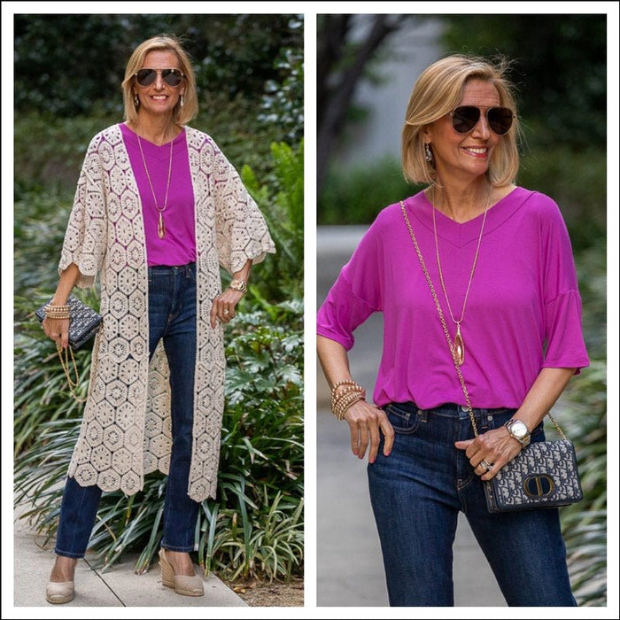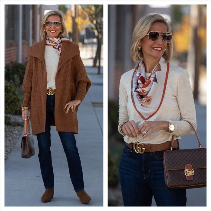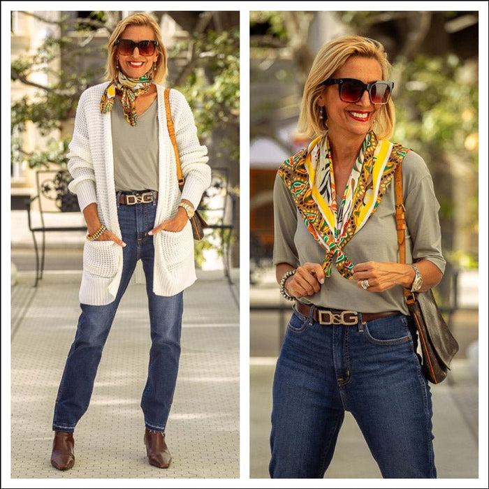 For today’s look I am wearing this cardigan over our Ivory round neck elbow length sleeve top. This is a great layering piece. I also...
