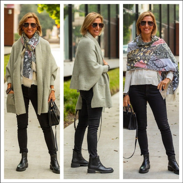 Sage Shrug Cardigan Mixed With A Snakeskin Print Scarf