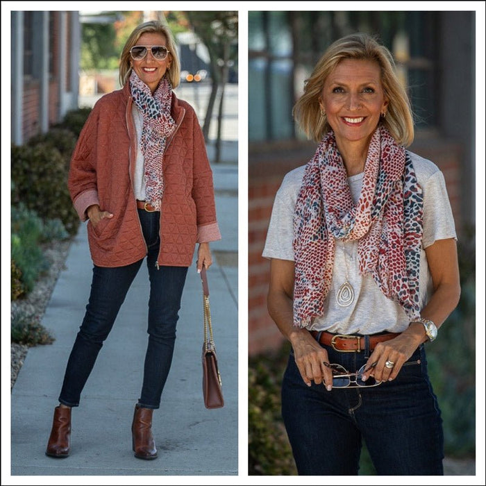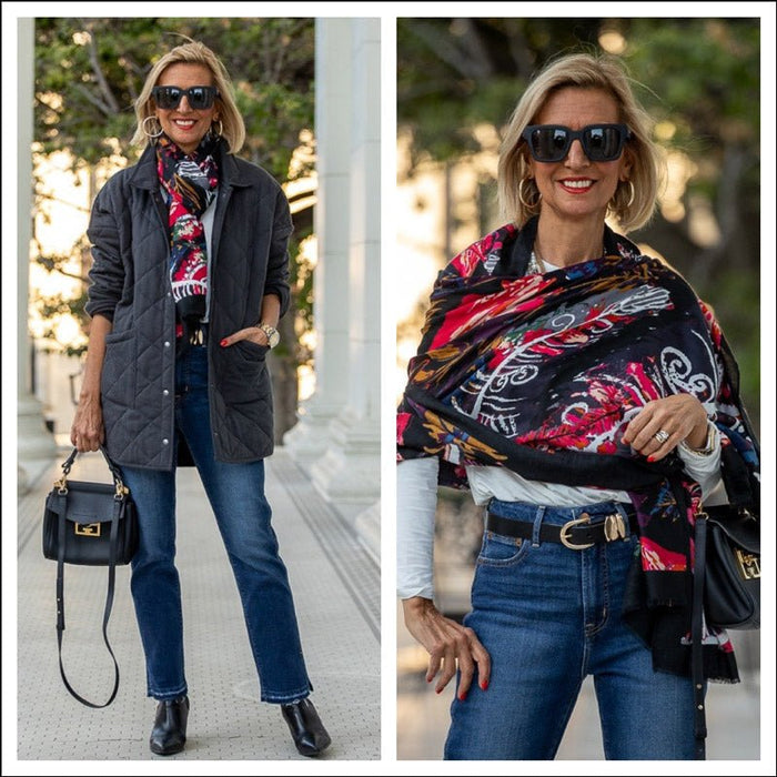 Our Cozy Charcoal Quilted Jacket Styled With A Colorful Scarf