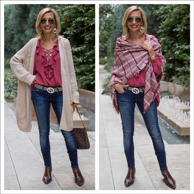 Our Cozy Ecru Cardigan And Maroon Ruffle Blouse