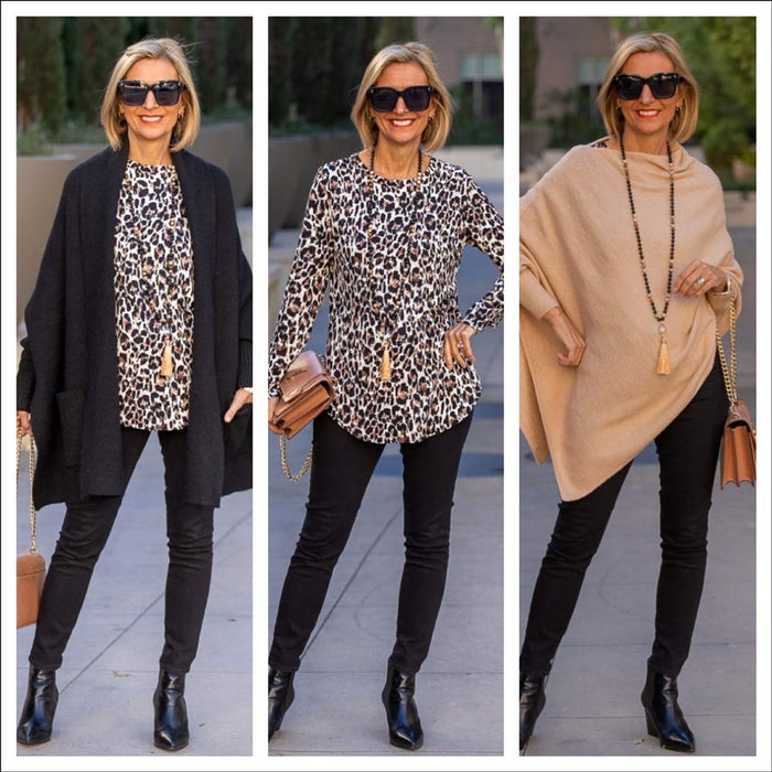 Black Shrug Cardigan And Tan Poncho Mixed With Leopard Top