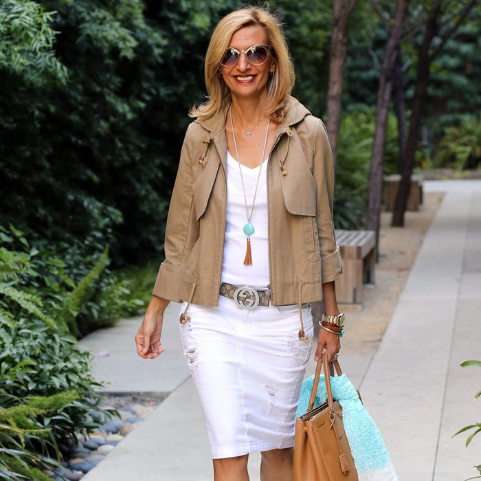 There are certain colors that work really well for transitional months. I believe one of these colors is olive or khaki. It’s one of those...