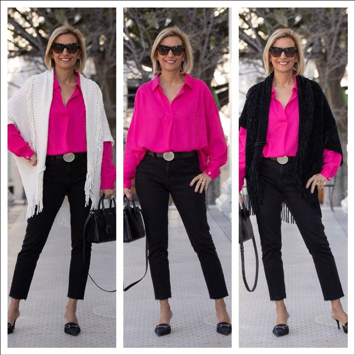 Fuchsia Shirt Styled With Two Chenille Cardigans