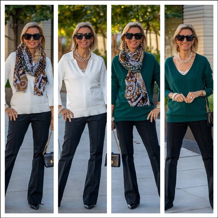 For today’s look, I have styled two of our beautiful sweater tops with a great colorful scarf and a couple of new jewelry pieces. The...