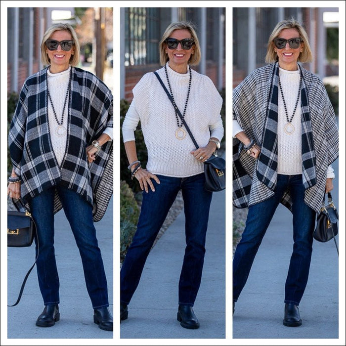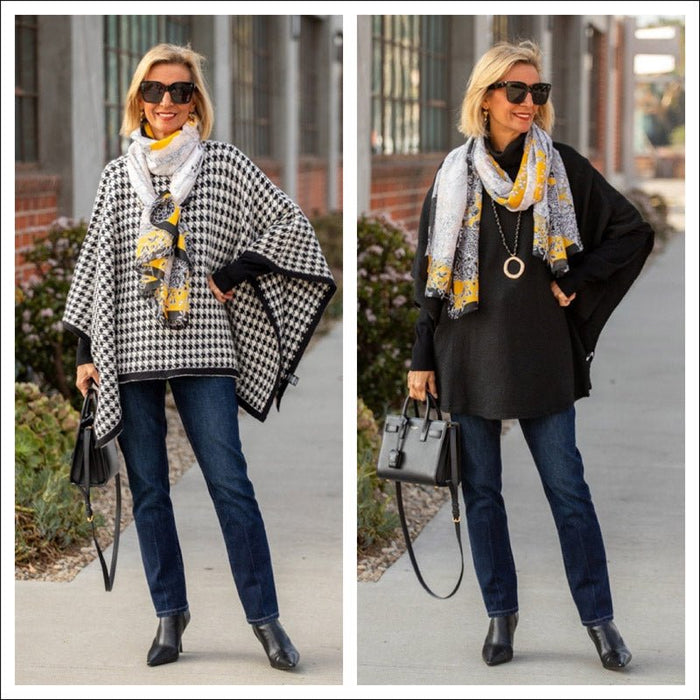 A Casual Yet Chic Look With Our Plaid Houndstooth Reversible Poncho