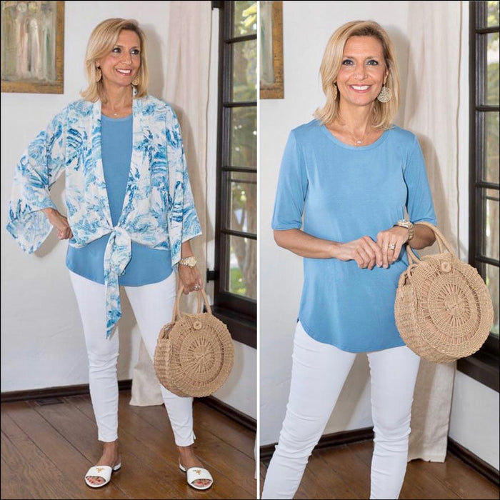 For today’s new look, I have a really cute new item that I love called the Blue Tropical Print Tie Front Kimono Jacket, which I...