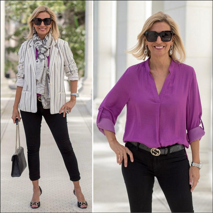 For today’s look I have restyled our Cream Gray Stripe One Button Blazer, this time with a great pop of color. This is a great...
