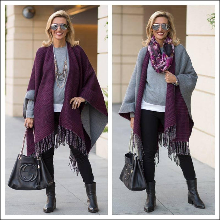 Our Purple Black Houndstooth And Solid Gray Reversible Poncho