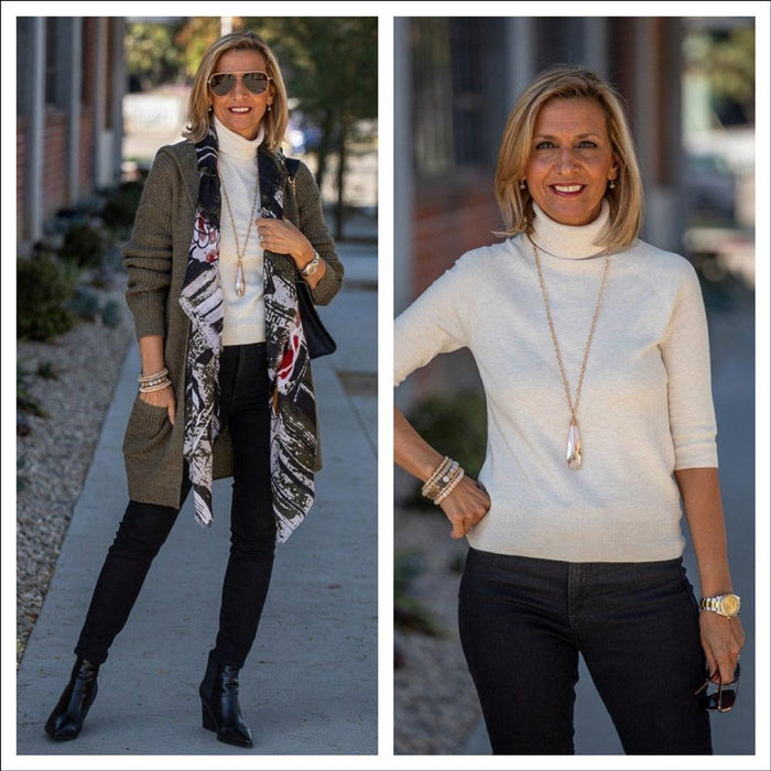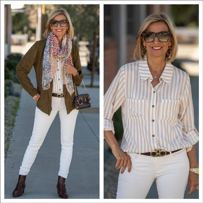 There are certain colors that work really well for transitional months. I believe one of these colors is olive or khaki. It’s one of those...