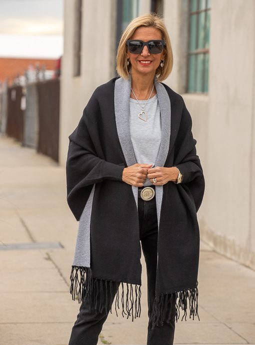 Here is our trendy Black And Gray Shrug Cardigan With Fringe