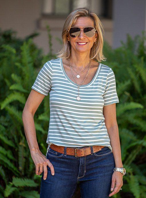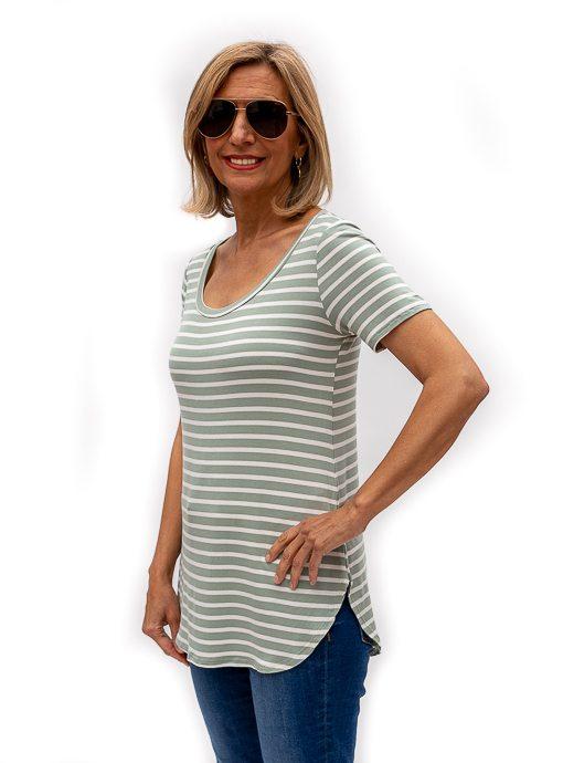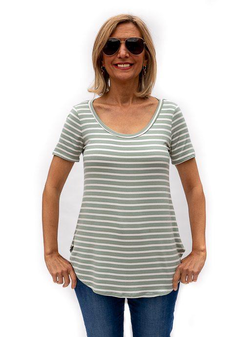 Take a look at our cute Sage Ivory Stripe Scoop Neck Short Sleeve Top